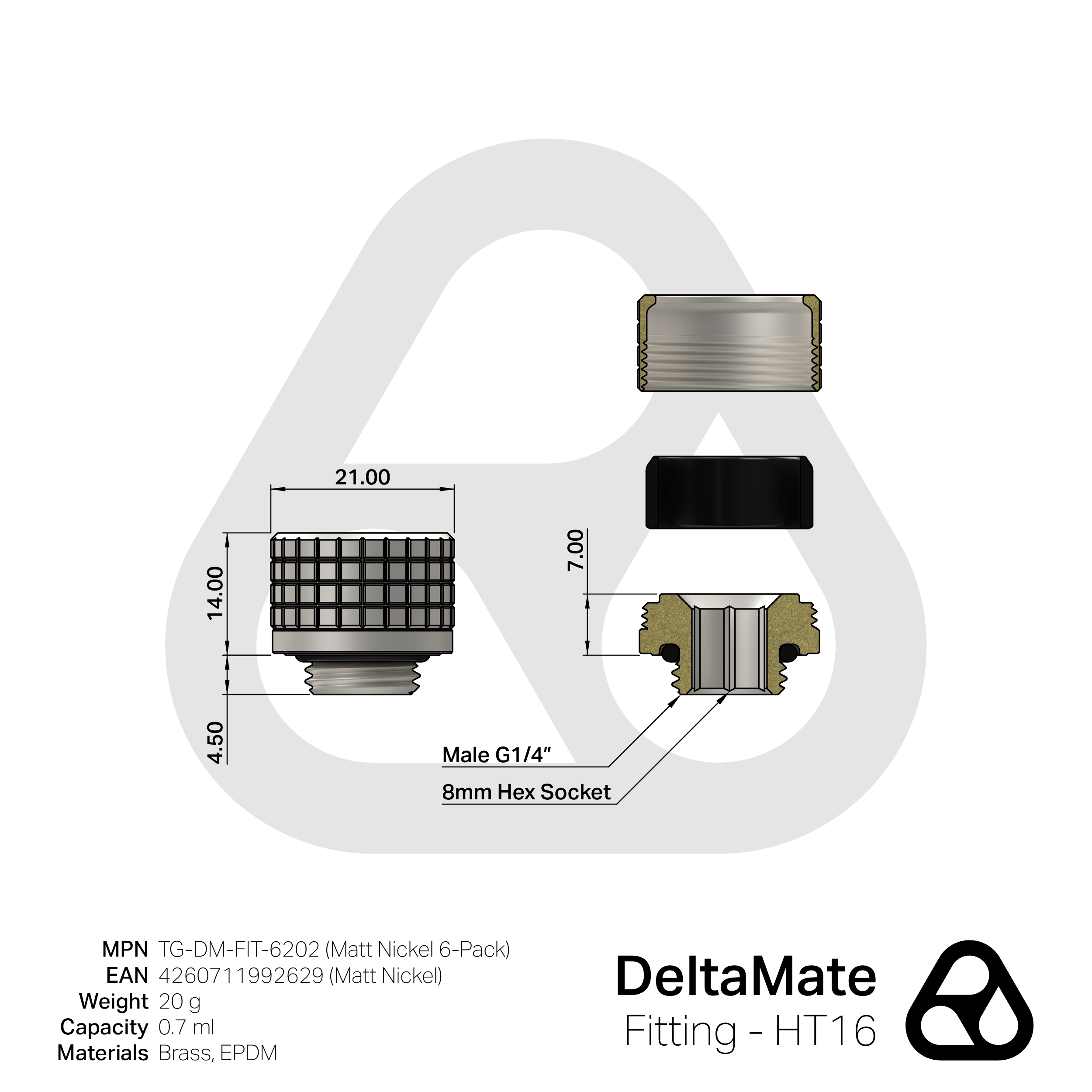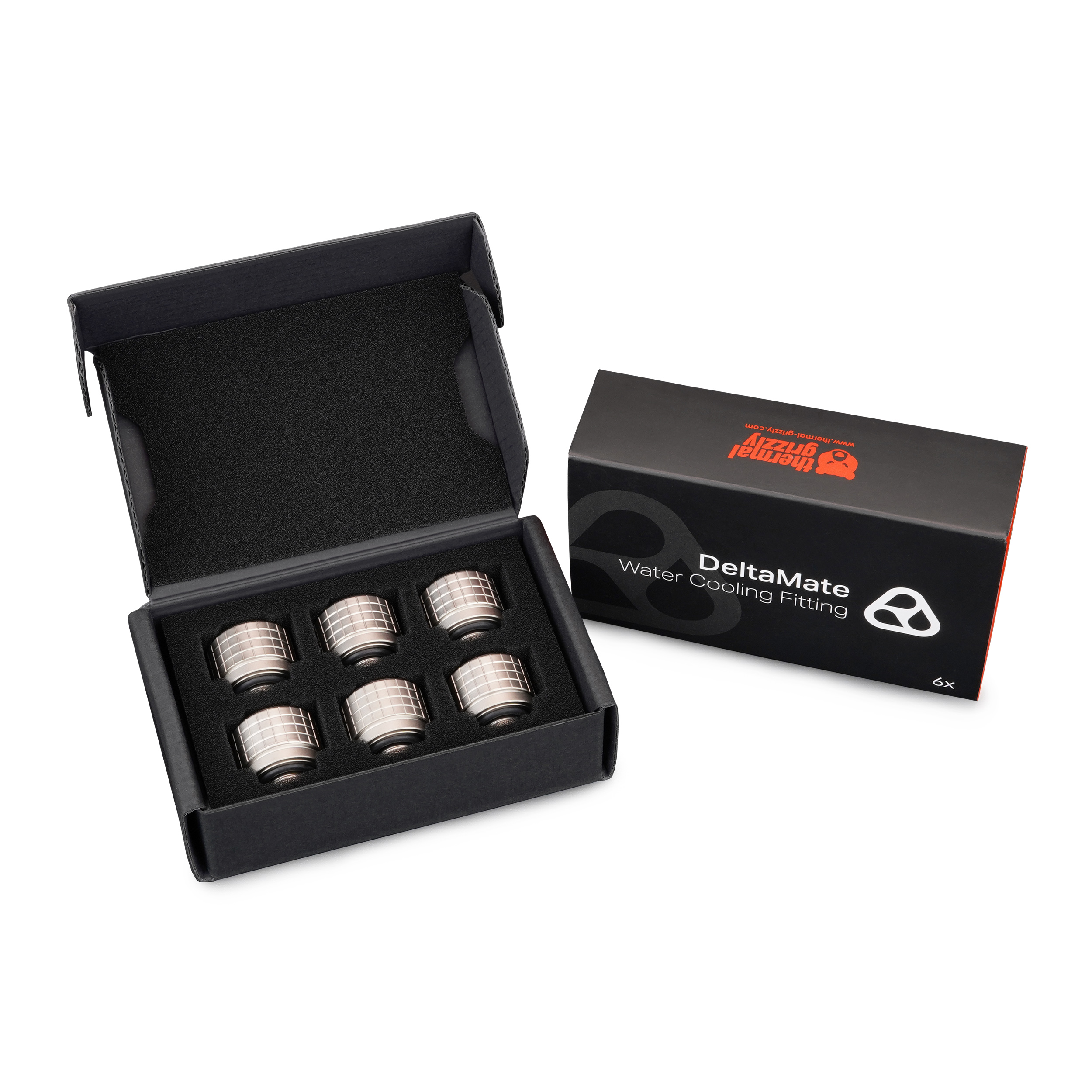 Die DeltaMate-Fittings sind Wasserkühlungs-Schlauchanschlüsse für die einzelnen Komponenten einer Custom-Wasserkühlung. In gewohnter Thermal-Grizzly-Qualität werden die Fittings maschinell aus Messing hergestellt. Messing bietet als Legierung aus Kupfer und Zink den Vorteil, dass es anodisch kompatibel mit anderen Metallen und dabei sowohl härter als auch korrosionsbeständiger als Kupfer ist. Die Dichtungsringe (O-Ringe) werden aus dem besonders elastischen sowie Ozon- und UV-beständigen EPDM (Ethylen-Propylen-Dien-Kautschuk) gefertigt. Das robuste Design der DeltaMate-Fittings ermöglicht die Montage mit einem 8-mm-Innensechskantschlüssel. Der einheitliche Außendurchmesser aller DeltaMate-Anschlüsse ermöglicht eine nahtlose Integration der einzelnen Produkte.
