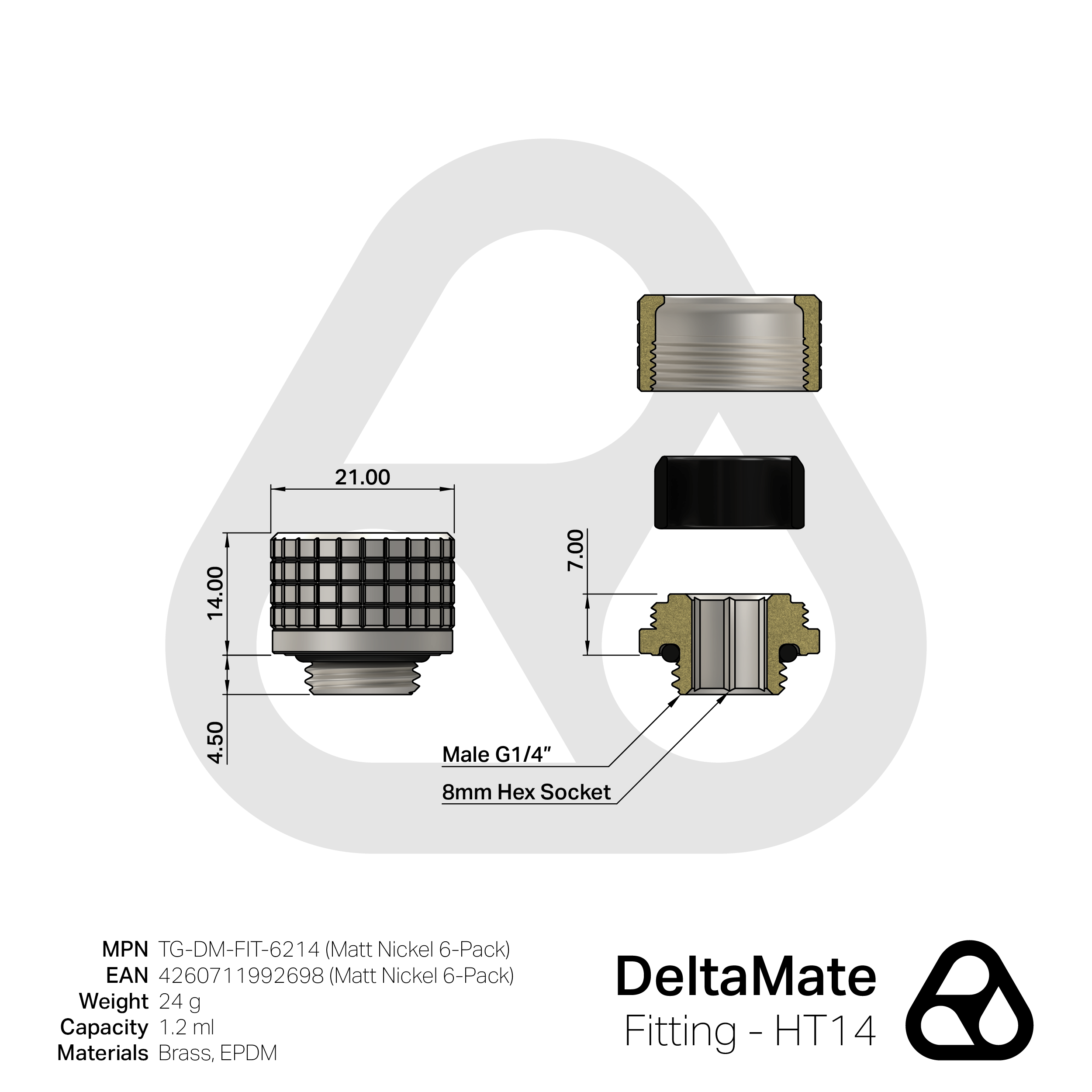 Die DeltaMate-Fittings sind Wasserkühlungs-Schlauchanschlüsse für die einzelnen Komponenten einer Custom-Wasserkühlung. In gewohnter Thermal-Grizzly-Qualität werden die Fittings maschinell aus Messing hergestellt. Messing bietet als Legierung aus Kupfer und Zink den Vorteil, dass es anodisch kompatibel mit anderen Metallen und dabei sowohl härter als auch korrosionsbeständiger als Kupfer ist. Die Dichtungsringe (O-Ringe) werden aus dem besonders elastischen sowie Ozon- und UV-beständigen EPDM (Ethylen-Propylen-Dien-Kautschuk) gefertigt. Das robuste Design der DeltaMate-Fittings ermöglicht die Montage mit einem 8-mm-Innensechskantschlüssel. Der einheitliche Außendurchmesser aller DeltaMate-Anschlüsse ermöglicht eine nahtlose Integration der einzelnen Produkte.