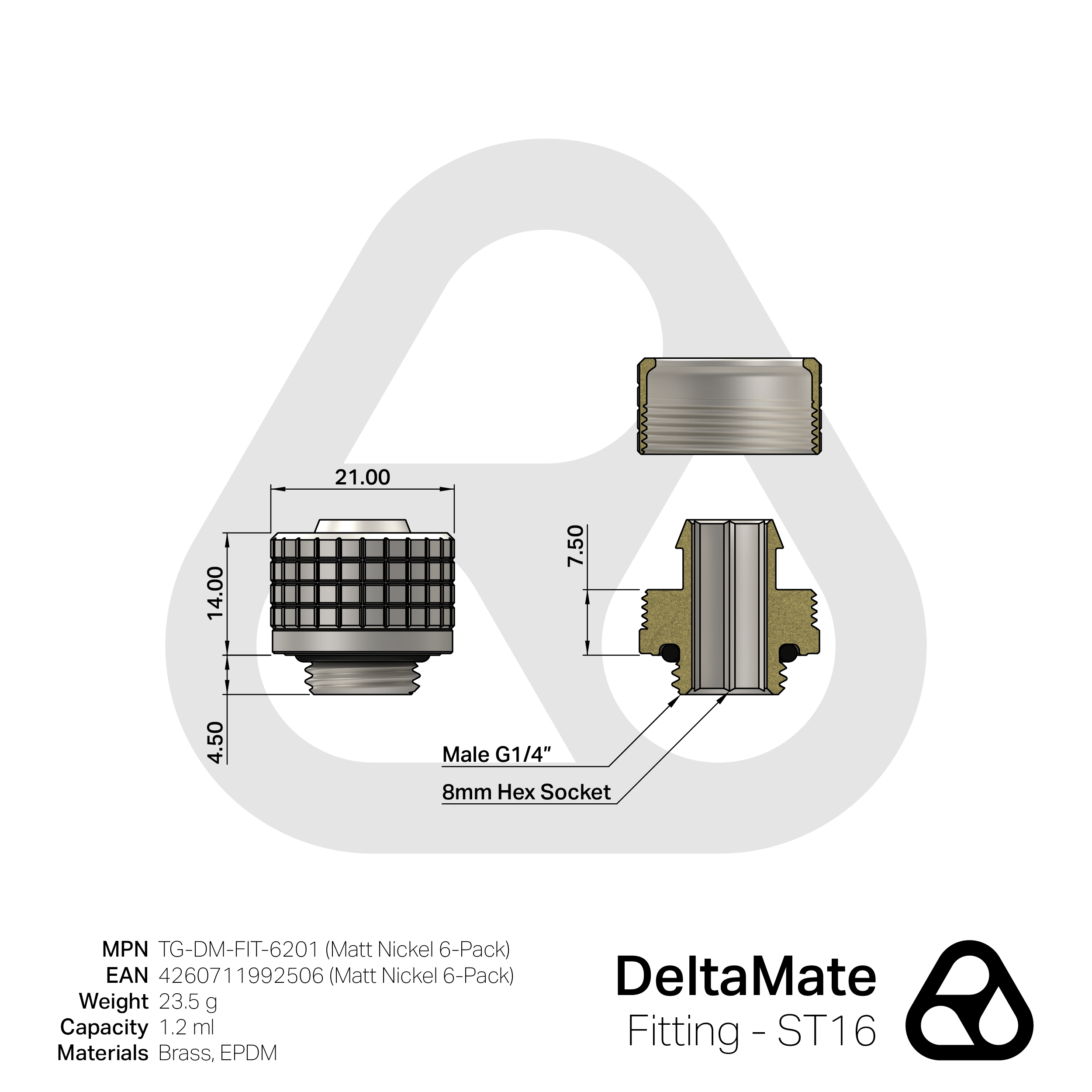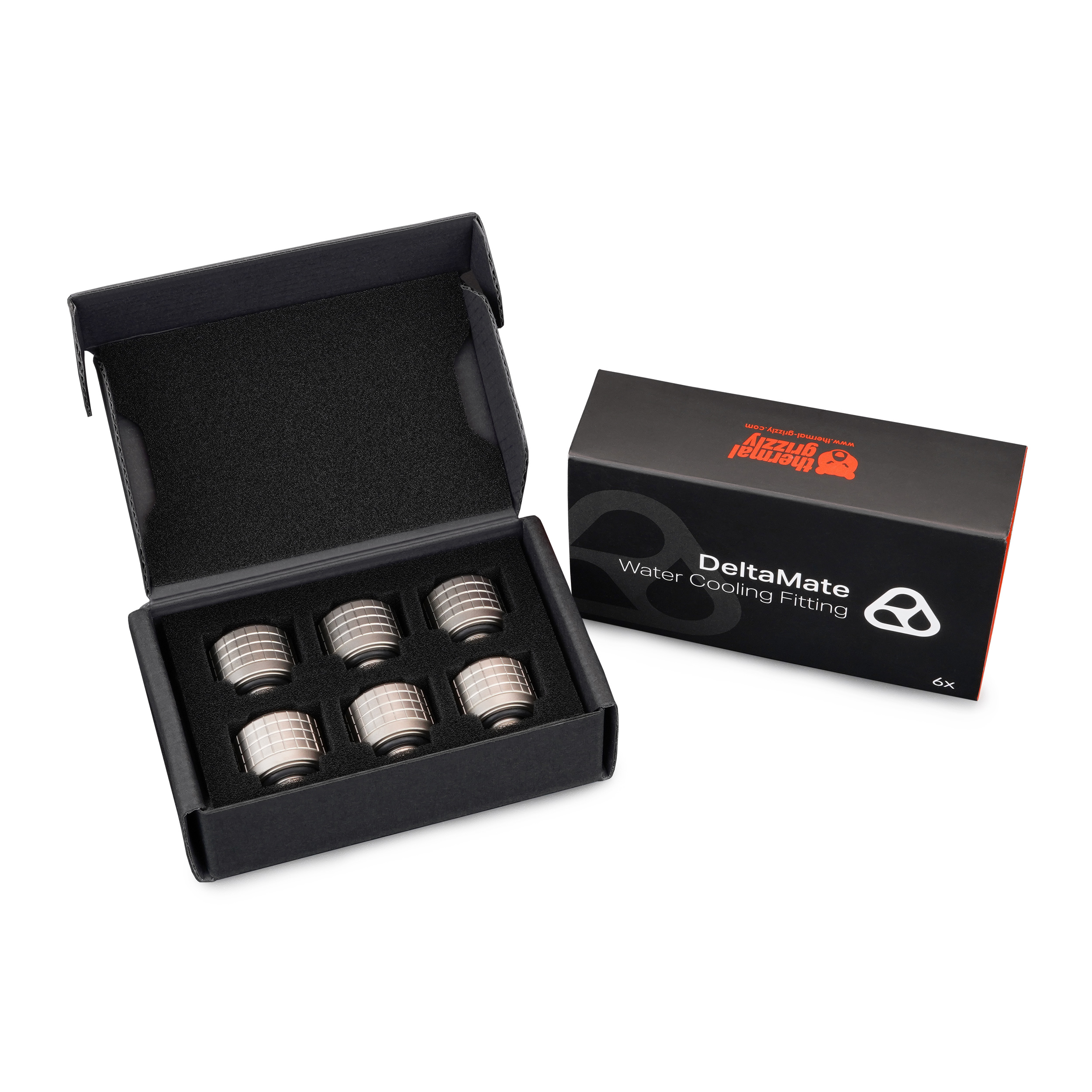 Die DeltaMate-Fittings sind Wasserkühlungs-Schlauchanschlüsse für die einzelnen Komponenten einer Custom-Wasserkühlung. In gewohnter Thermal-Grizzly-Qualität werden die Fittings maschinell aus Messing hergestellt. Messing bietet als Legierung aus Kupfer und Zink den Vorteil, dass es anodisch kompatibel mit anderen Metallen und dabei sowohl härter als auch korrosionsbeständiger als Kupfer ist. Die Dichtungsringe (O-Ringe) werden aus dem besonders elastischen sowie Ozon- und UV-beständigen EPDM (Ethylen-Propylen-Dien-Kautschuk) gefertigt. Das robuste Design der DeltaMate-Fittings ermöglicht die Montage mit einem 8-mm-Innensechskantschlüssel. Der einheitliche Außendurchmesser aller DeltaMate-Anschlüsse ermöglicht eine nahtlose Integration der einzelnen Produkte.