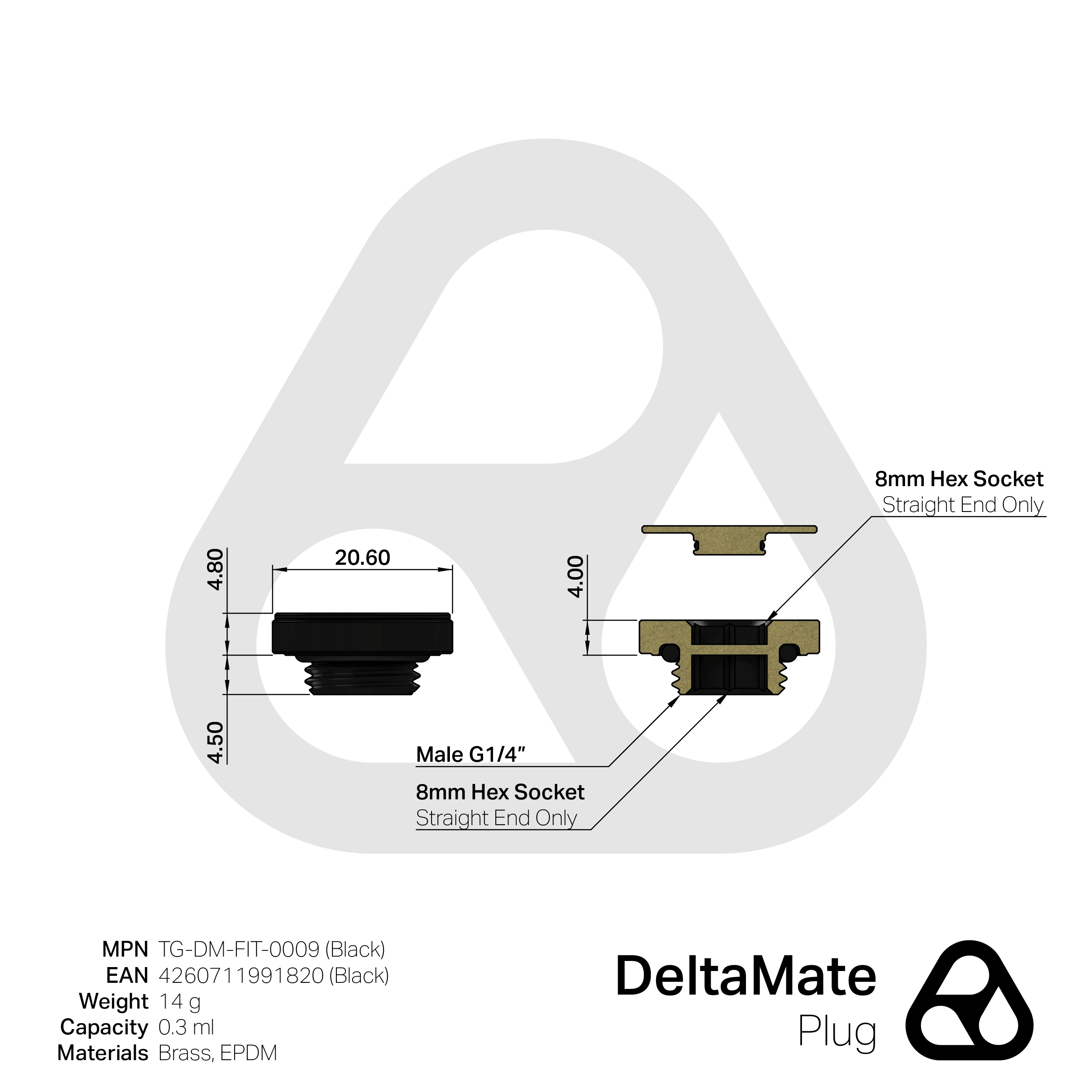 Der DeltaMate Verschlussstopfen ist ein flacher Stopfen zur Abdichtung beliebiger G1/4"-Innengewindeanschlüsse. Er bietet ein hochwertiges Finish in Form einer mattschwarzen Chrombeschichtung, die zudem leicht zu reinigen ist.