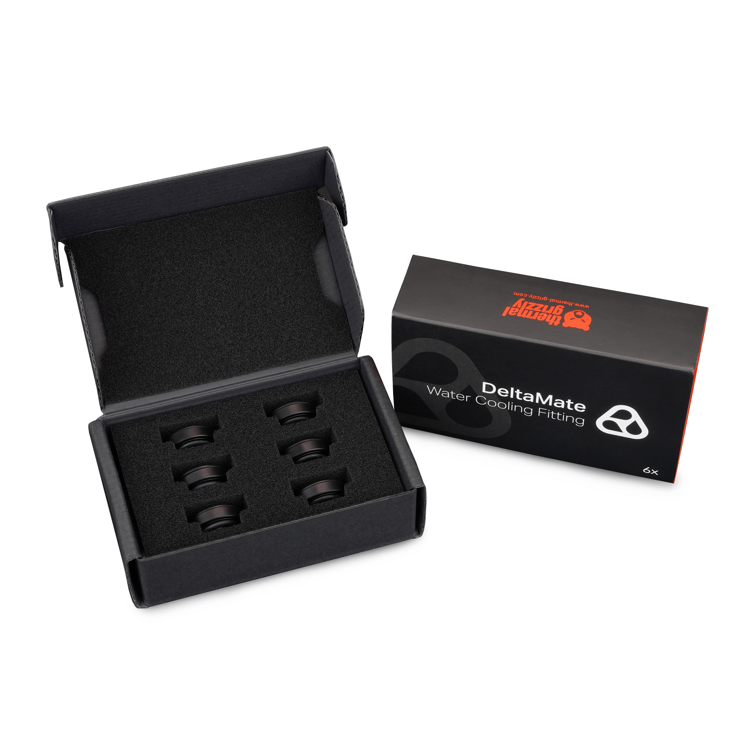 Die DeltaMate-Fittinge sind Wasserkühlungs-Anschlüsse für die einzelnen Komponenten einer Custom-Wasserkühlung. In gewohnter Thermal-Grizzly-Qualität werden die Extender Fittinge maschinell aus Messing hergestellt. Messing bietet als Legierung aus Kupfer und Zink den Vorteil, dass es anodisch kompatibel mit anderen Metallen und dabei sowohl härter als auch korrosionsbeständiger als Kupfer ist. Die Dichtungsringe (O-Ringe) werden aus dem besonders elastischen sowie Ozon- und UV-beständigen EPDM (Ethylen-Propylen-Dien-Kautschuk) gefertigt. Das robuste Design der DeltaMate-Fittinge ermöglicht die Montage mit einem 8-mm-Innensechskantschlüssel. Der einheitliche Außendurchmesser aller DeltaMate-Anschlüsse ermöglicht eine nahtlose Integration der einzelnen Produkte.