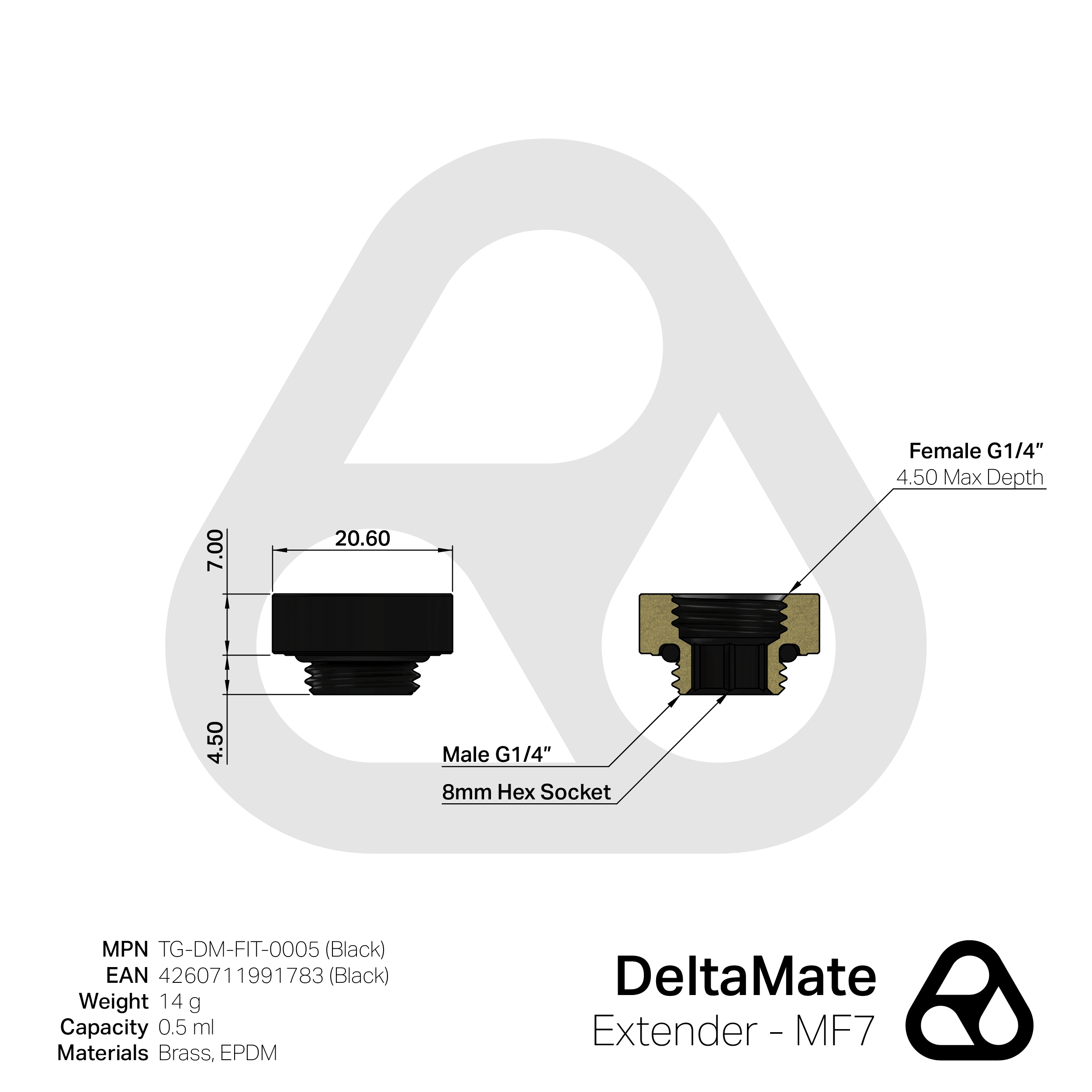 Der DeltaMate Extender - MF7 verfügt über jeweils ein G1/4”-Außen (Male)- und Innengewinde (Female) und bietet ein hochwertiges Finish in Form einer mattschwarzen Chrombeschichtung, die zudem leicht zu reinigen ist. Als Verlängerungsanschluss wird der Extender zwischen dem Anschluss an der Wasserkühlungskomponenten und dem Fitting verwendet und vergrößert den Abstand um 7 mm. Kann mit zwei DeltaMate Rotary - 90° kombiniert werden, um einen Double Rotary mit einem Versatz von 28 mm zu bilden.
