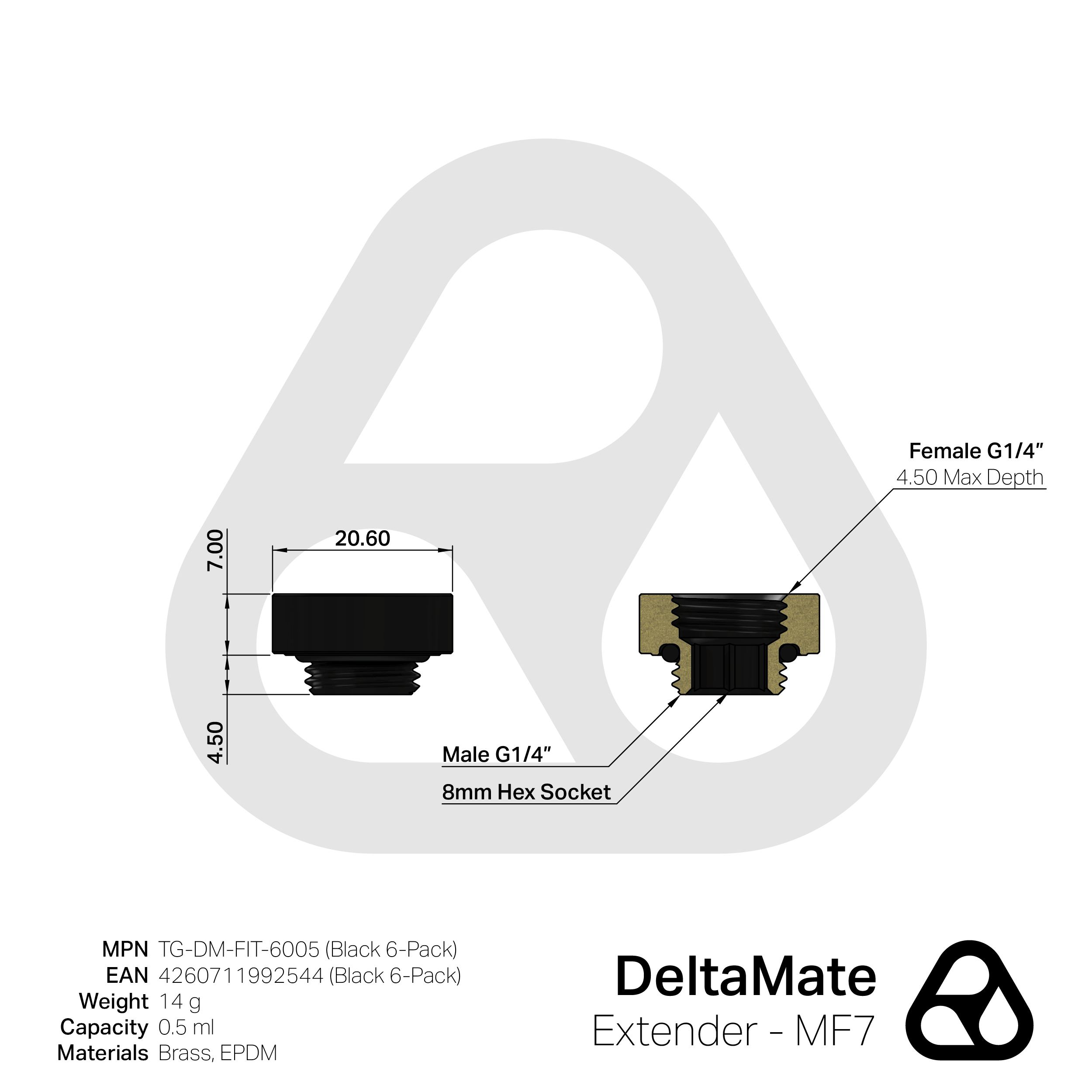 Die DeltaMate-Extender Fittings sind Wasserkühlungs-Anschlüsse für die einzelnen Komponenten einer Custom-Wasserkühlung. In gewohnter Thermal-Grizzly-Qualität werden die Extender Fittings maschinell aus Messing hergestellt. Messing bietet als Legierung aus Kupfer und Zink den Vorteil, dass es anodisch kompatibel mit anderen Metallen und dabei sowohl härter als auch korrosionsbeständiger als Kupfer ist. Die Dichtungsringe (O-Ringe) werden aus dem besonders elastischen sowie Ozon- und UV-beständigen EPDM (Ethylen-Propylen-Dien-Kautschuk) gefertigt. Das robuste Design der DeltaMate-Fittings ermöglicht die Montage mit einem 8-mm-Innensechskantschlüssel. Der einheitliche Außendurchmesser aller DeltaMate-Anschlüsse ermöglicht eine nahtlose Integration der einzelnen Produkte.