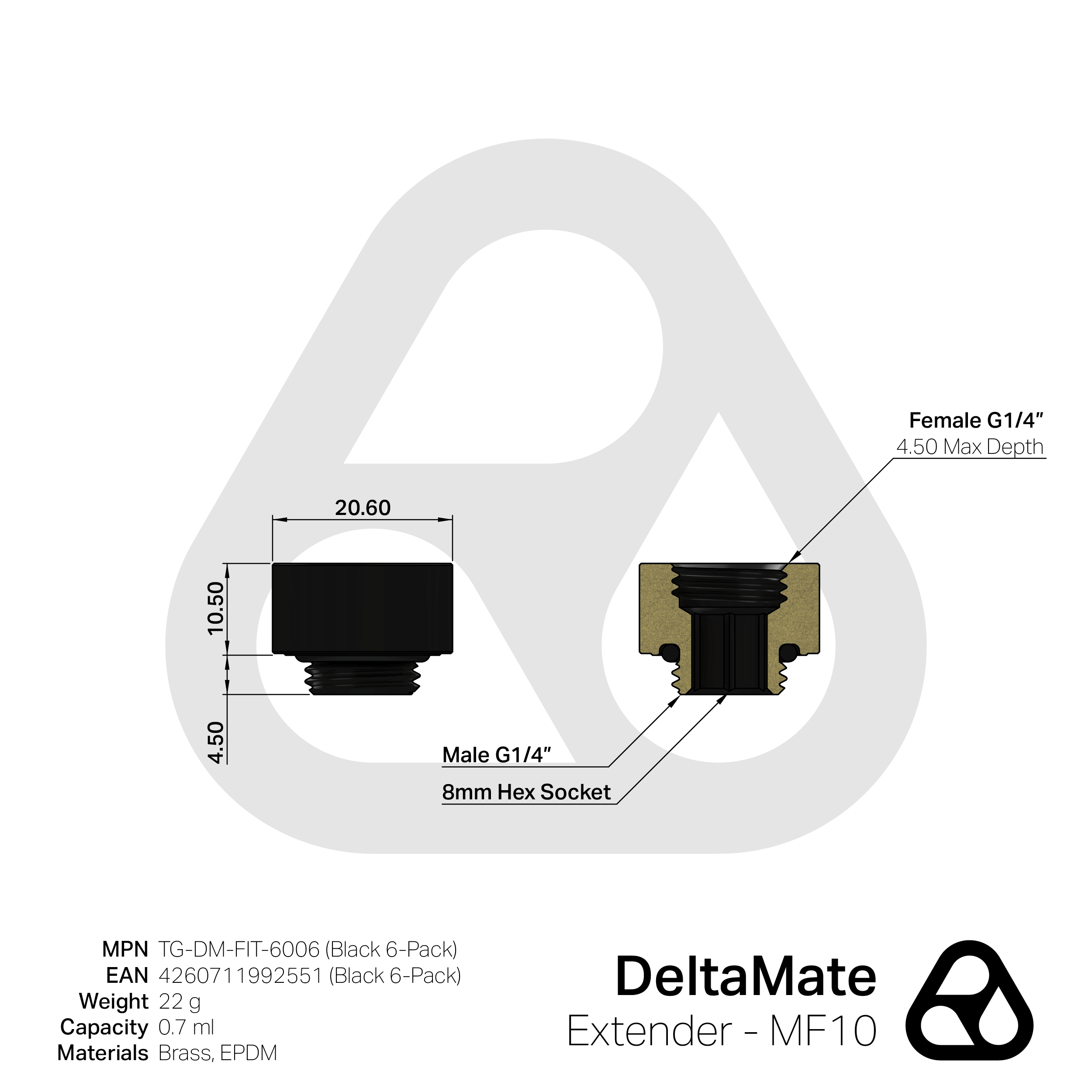 Die DeltaMate-Extender Fittings sind Wasserkühlungs-Anschlüsse für die einzelnen Komponenten einer Custom-Wasserkühlung. In gewohnter Thermal-Grizzly-Qualität werden die Extender Fittings maschinell aus Messing hergestellt. Messing bietet als Legierung aus Kupfer und Zink den Vorteil, dass es anodisch kompatibel mit anderen Metallen und dabei sowohl härter als auch korrosionsbeständiger als Kupfer ist. Die Dichtungsringe (O-Ringe) werden aus dem besonders elastischen sowie Ozon- und UV-beständigen EPDM (Ethylen-Propylen-Dien-Kautschuk) gefertigt. Das robuste Design der DeltaMate-Fittings ermöglicht die Montage mit einem 8-mm-Innensechskantschlüssel. Der einheitliche Außendurchmesser aller DeltaMate-Anschlüsse ermöglicht eine nahtlose Integration der einzelnen Produkte.