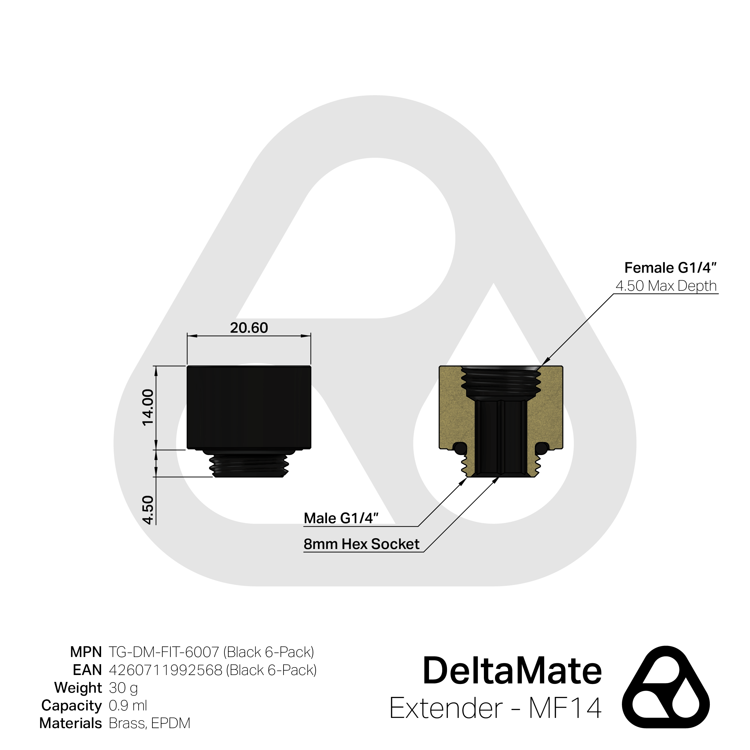 Der DeltaMate Extender - MF14 verfügt über jeweils ein G1/4”-Außen (Male)- und Innengewinde (Female) und bietet ein hochwertiges Finish in Form einer mattschwarzen Chrombeschichtung, die zudem leicht zu reinigen ist. Als Verlängerungsanschluss wird der Extender zwischen dem Anschluss an der Wasserkühlungskomponenten und dem Fitting verwendet und vergrößert den Abstand um 14 mm.