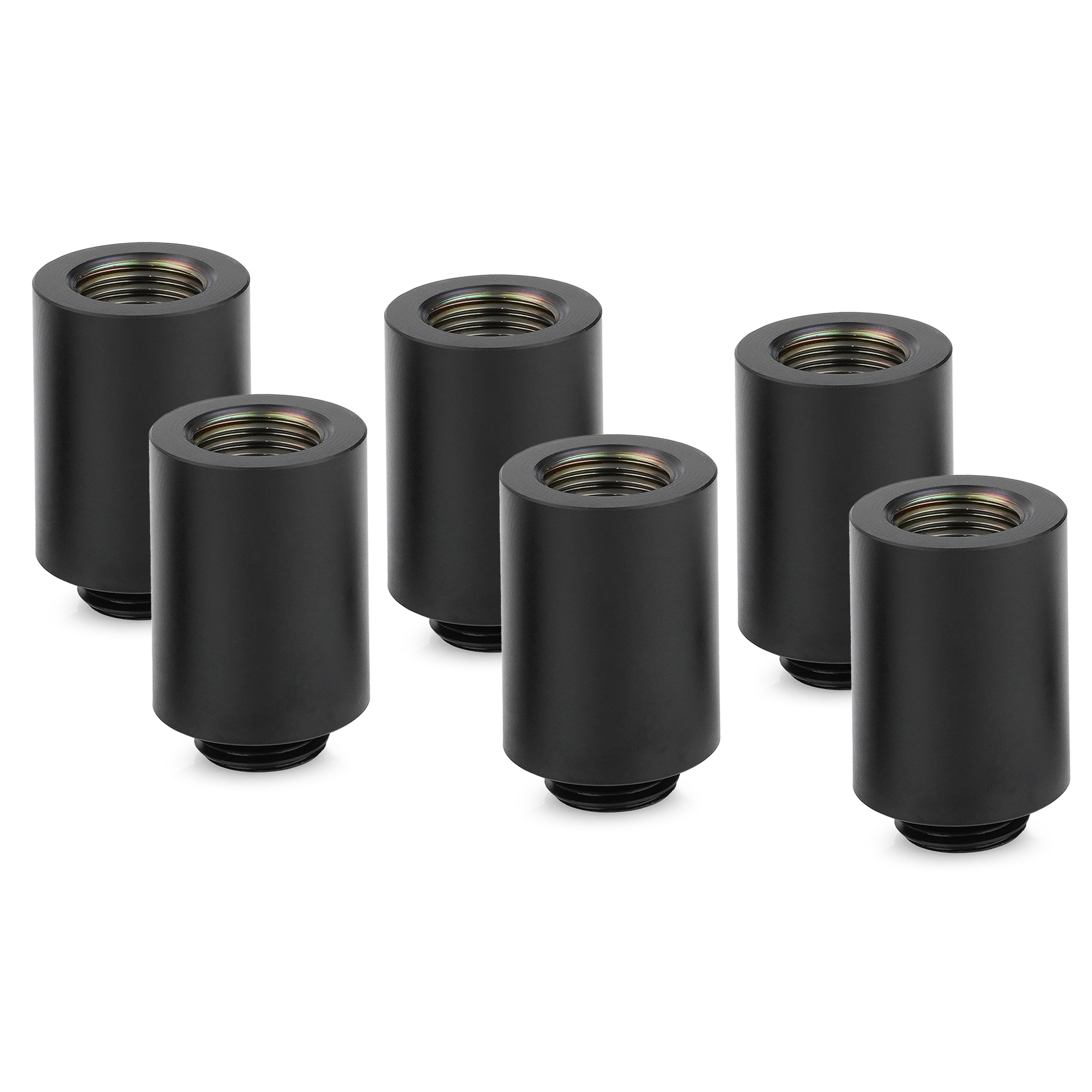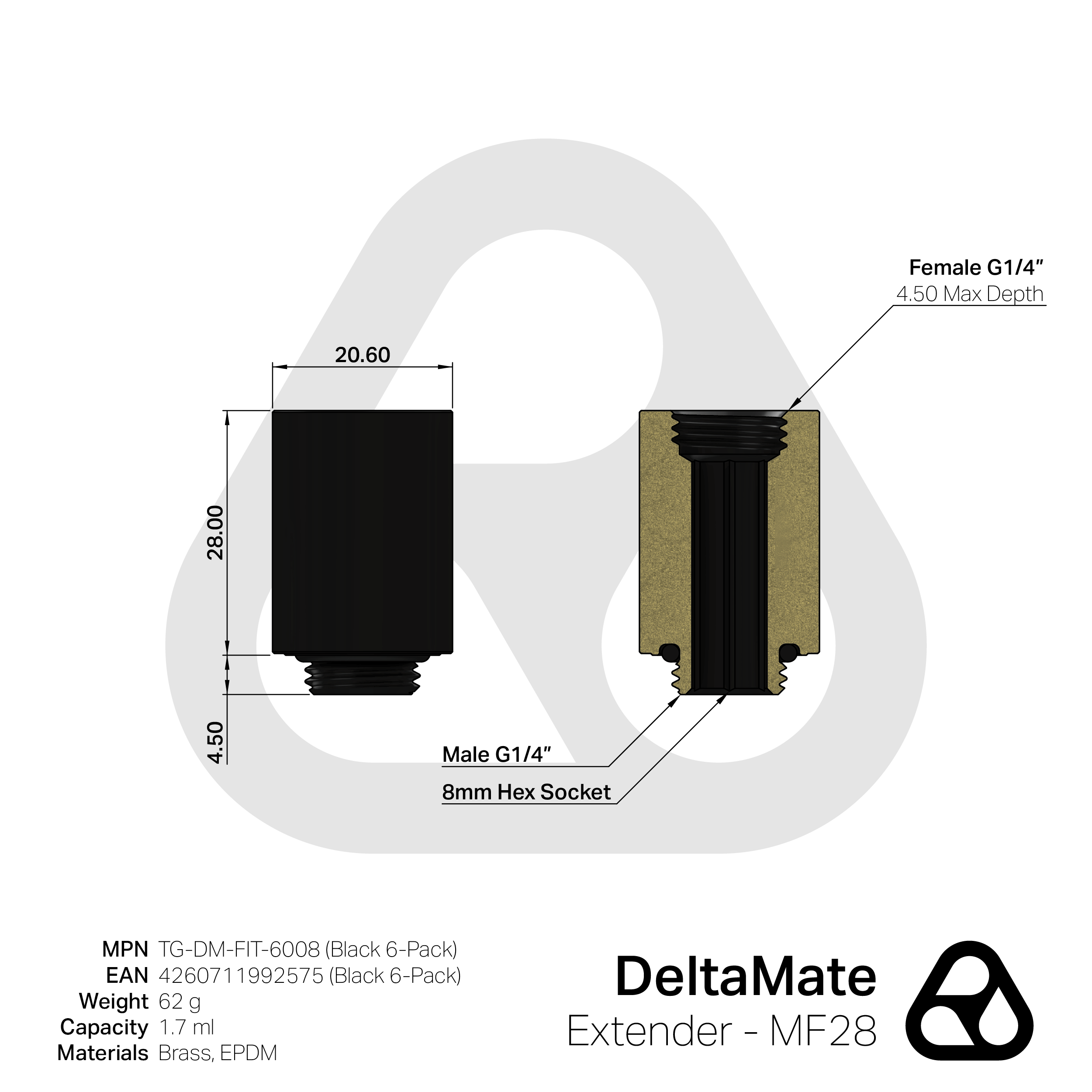 Der DeltaMate Extender - MF28 verfügt über jeweils ein G1/4”-Außen (Male)- und Innengewinde (Female) und bietet ein hochwertiges Finish in Form einer mattschwarzen Chrombeschichtung, die zudem leicht zu reinigen ist. Als Verlängerungsanschluss wird der Extender zwischen dem Anschluss an der Wasserkühlungskomponenten und dem Fitting verwendet und vergrößert den Abstand um 28 mm. Wird häufig verwendet, um Platz für RAM-Sticks und Lüfter oder zwei parallele Rohre in derselben Ebene zu schaffen.
